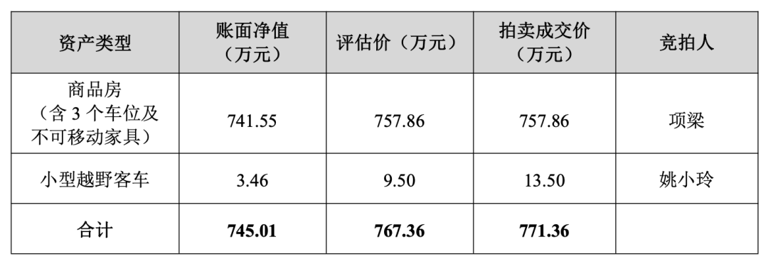 有趣的是,其中1处商品房及1辆小型越野客车确认竞拍产生的最终买受人为公司关联自然人项梁、姚小玲,最终成交价合计为771.36万元。